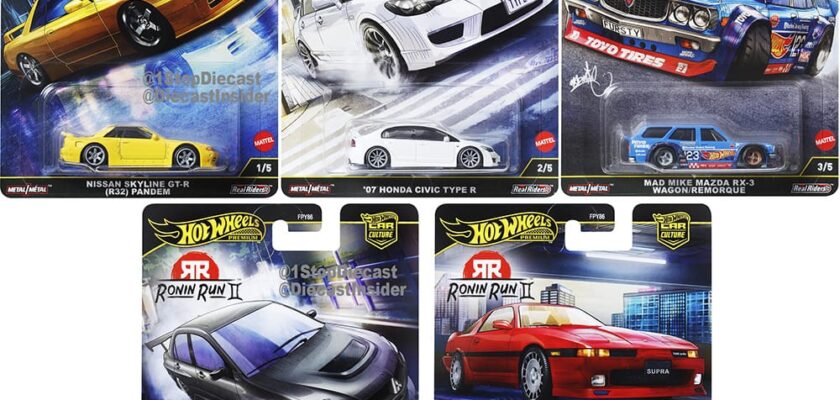 The Hot Wheels Car Culture Ronin Run II is an exciting set featuring impressive models such as the Nissan Skyline GT-R (R32), Lancer Evolution IX, and Toyota Supra.